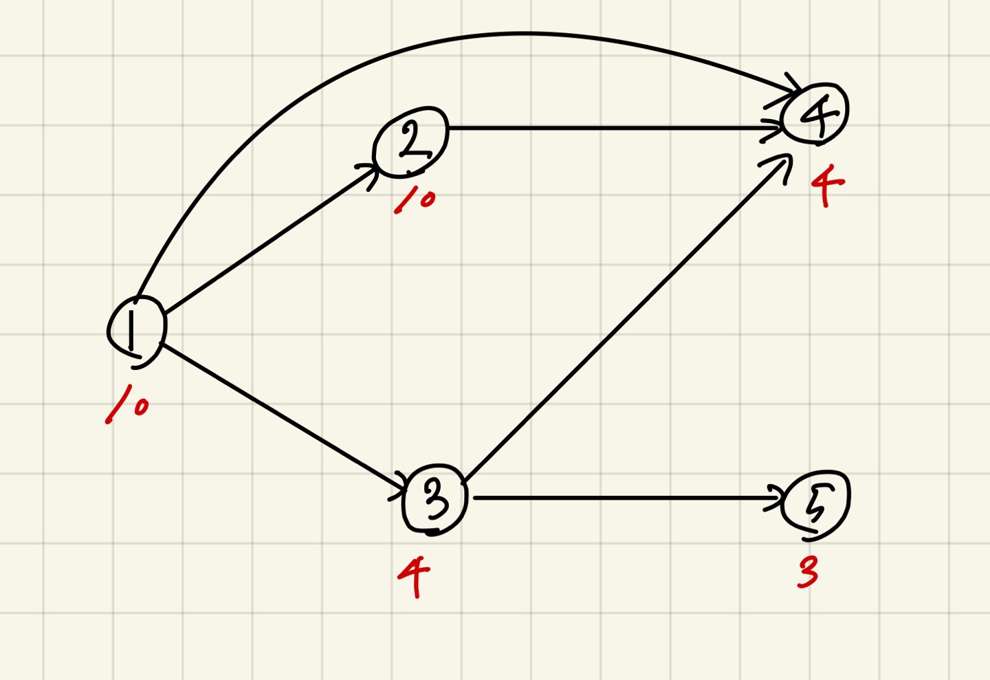 4를 짓기 위해서는 1,2,3을 지어야한다. 그렇다면, 2,3을 짓고 4를 지어야하는데 2번의 경우 20, 3번의 경우 14이다. 여기서 그냥 위상정렬대로 전입차수가 0이라고 더하면 24가될수도, 18이 될 수 있다.