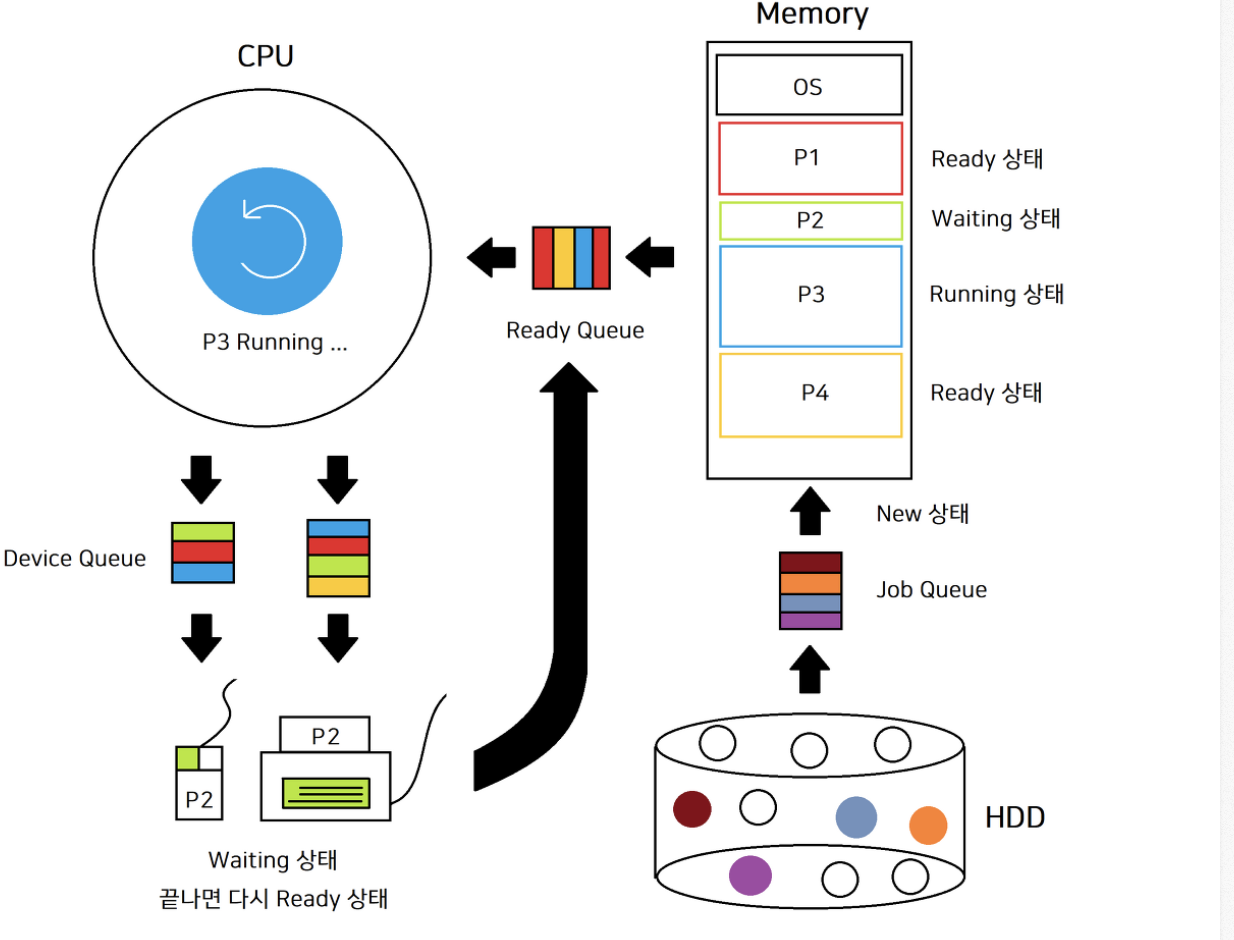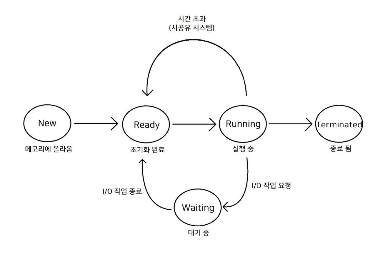 - Terminated: 프로그램 종료프로세스 생명주기는 위 처럼 5가지 상태를 지닌다.