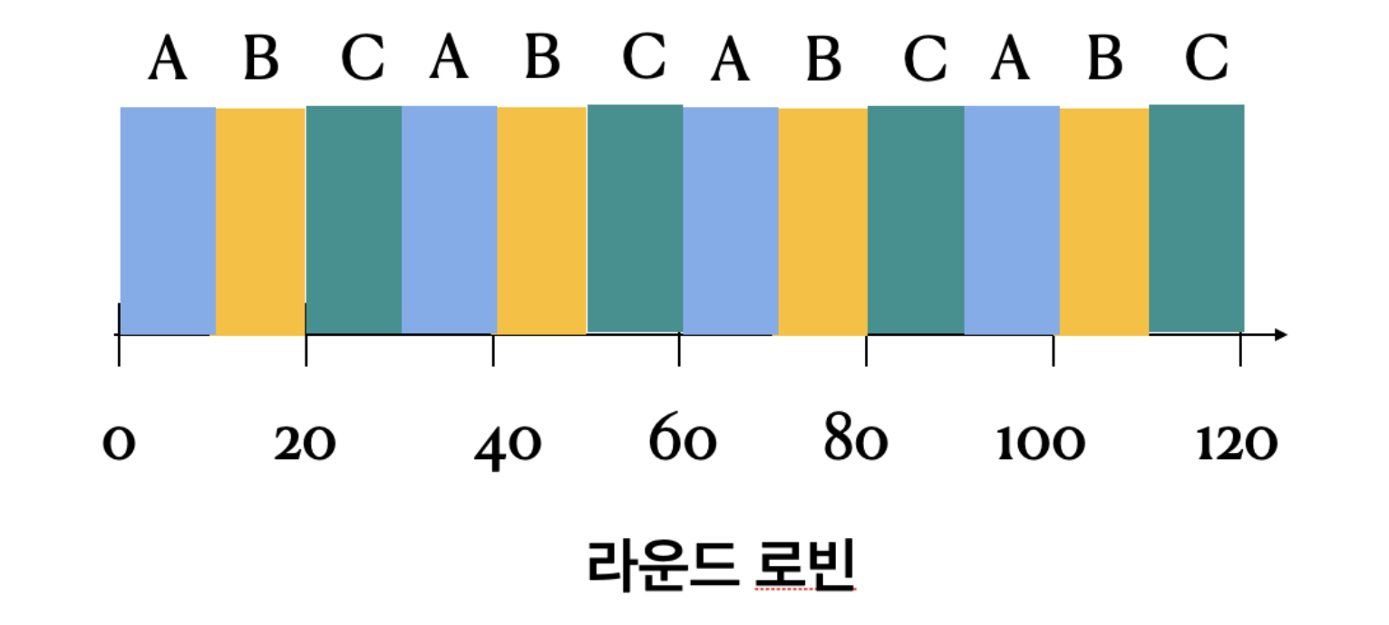 - 응답시간 문제 해결을 위해 라운드 로빈 방법은 돌아가며 프로세스를 할당해주는 방식이다.