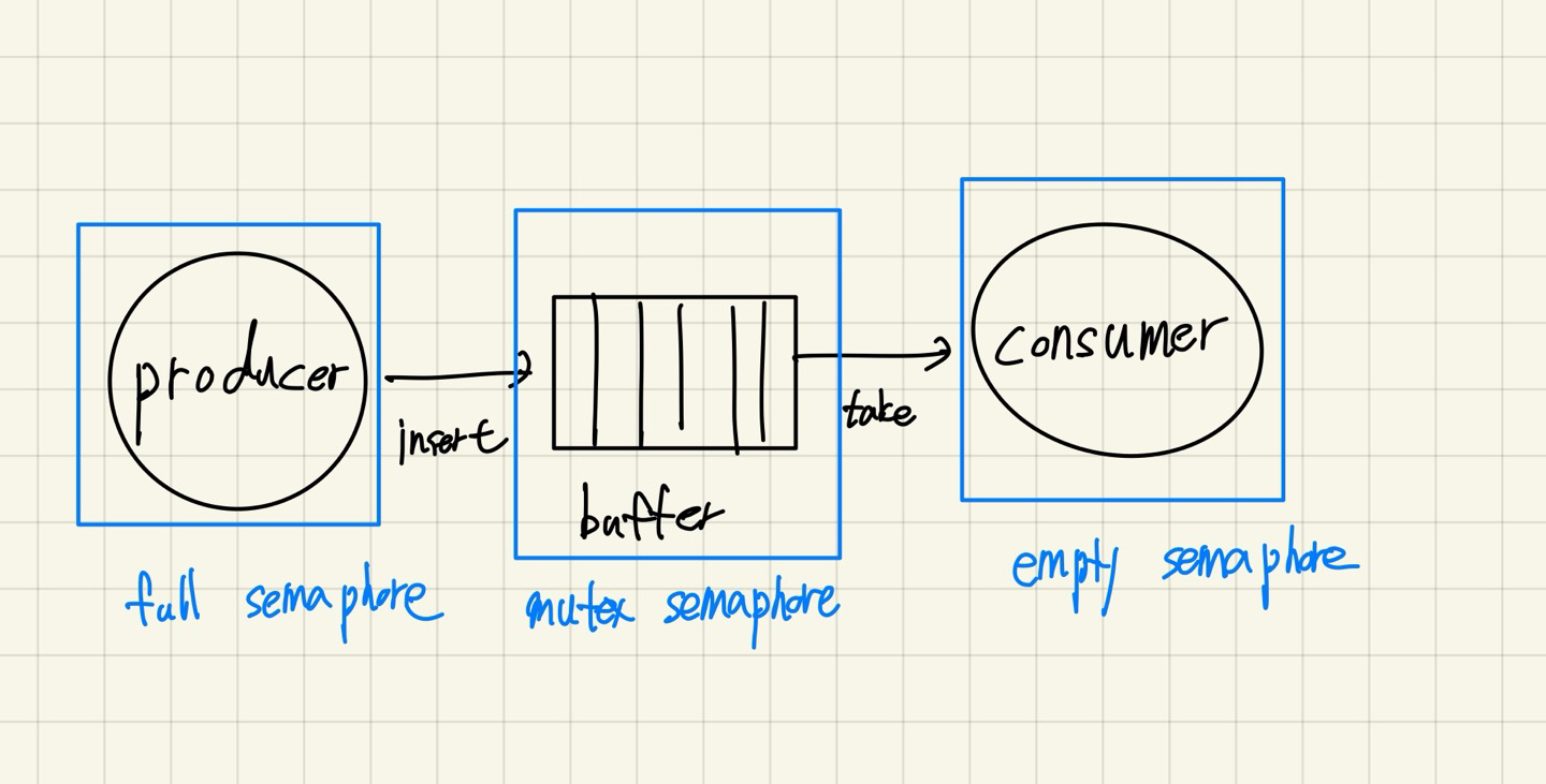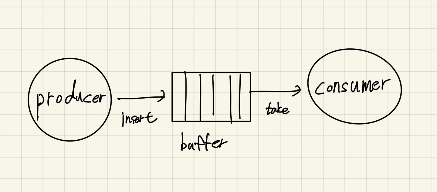 - 생산자는 데이터를 생성하고서 바로 소비자에게 넘기지 않는다. I/O차이, 연산차이 등 속도를 맞추기 위해 먼저 buffer에 데이터를 삽입하고 이후 소비자가 버퍼에 접근해 take 하는 식으로 처리된다. 즉, 버퍼는 생산자와 소비자가 모두 접근하는 Critical Section이 되는 것이다.