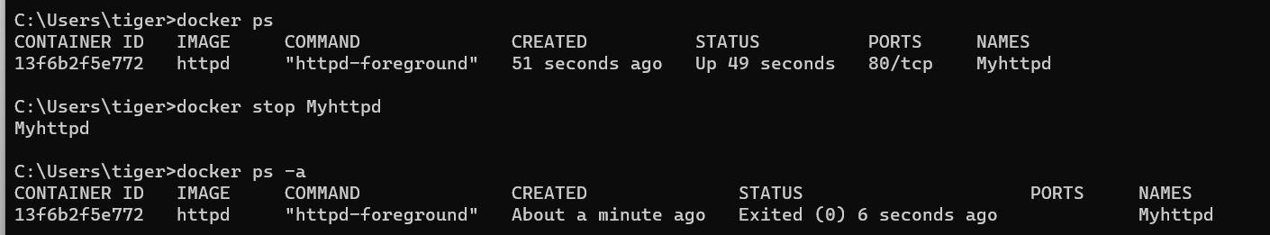 - docker stop [image name] : 이미지 컨테이너 멈춤