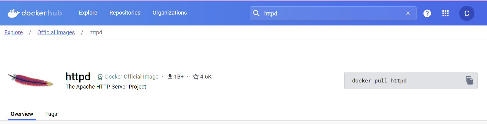이 사이트에서 자신이 원하는 도커 이미지를 찾아 다운받을 수 있다. 난 테스트로 httpd를 다운받아 보았다.