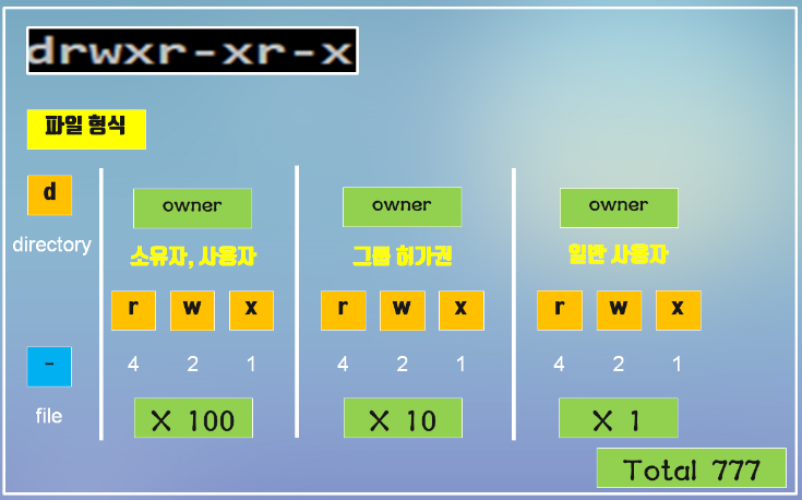 r w x 순서로 기입되며 읽기, 쓰기, 실행 권한을 나타낸다.