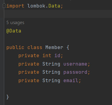 이걸 보면 원래 자바 유저들은 "getter setter도 없는 그냥 빈 클래스군" 하겠지만 저 위의 @Data 는 getter setter가 숨겨져있는 것이다. 보다시피 getId를 사용할 수 있다.