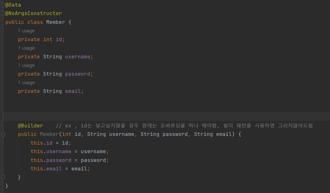 만약 id를 빼고 생성하고 싶다면 오버로딩을 통해 하나의 생성자를 더 만들어야할 것이다. 그러나 빌더를 사용하면