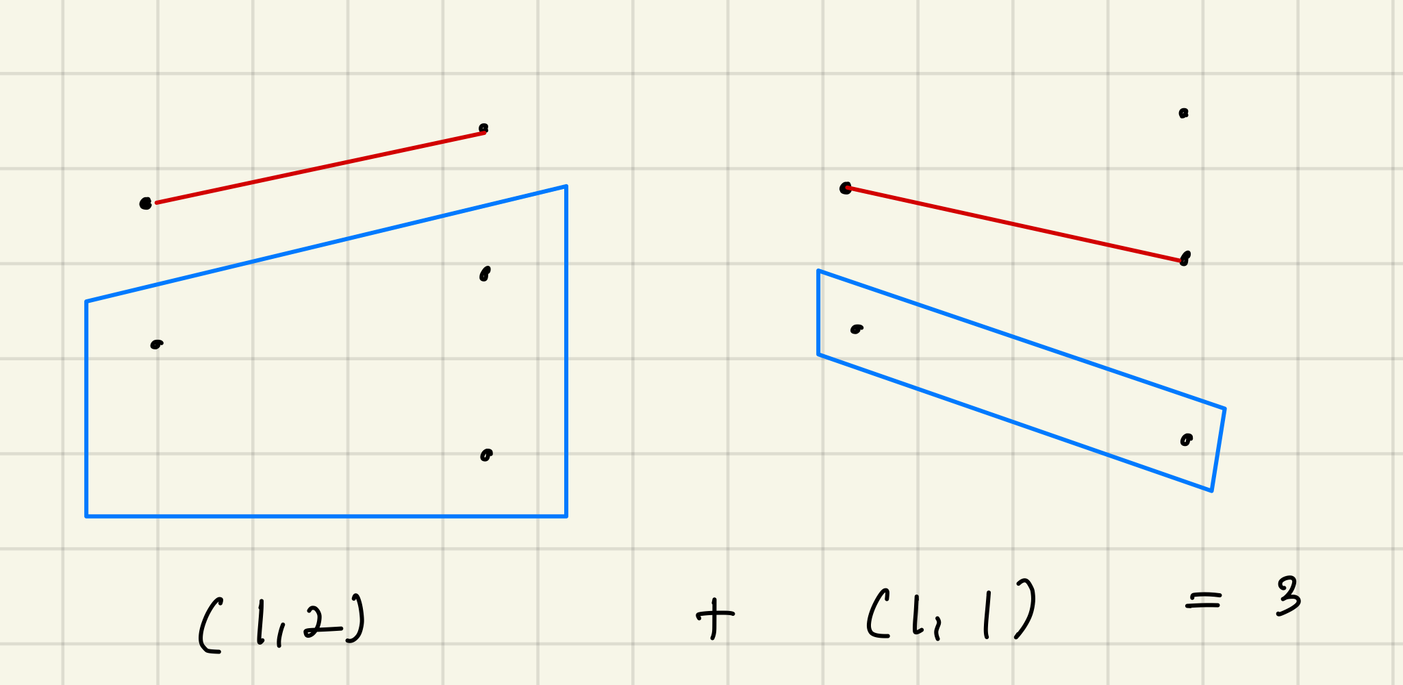 빨간색 선들을 기준선으로 볼 때 뭔가 점화식이 보이는 것 같다. 작은 것들을 사용하여 큰것을 해결하는 정석적인 DP인 Bottom Up 이 보인다. 하지만 하나만 더 해보자. 이번엔 2 -> 4 를 가정하자. 이 점화식이 맞다면 (2, 4) = (1, 1) + (1, 2) + (1, 3) 이 되어야할 것이다.