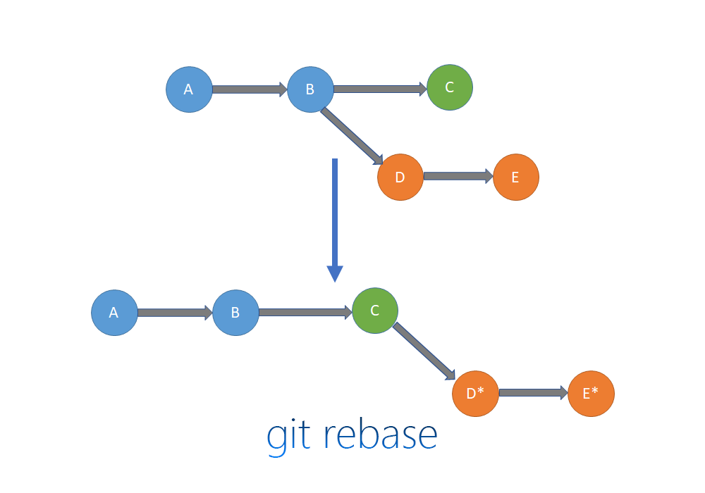 원래 D는 B에서 나온 분기였다. 하지만 rebase 함으로서 D는 c의 다음 분기가 되었다.