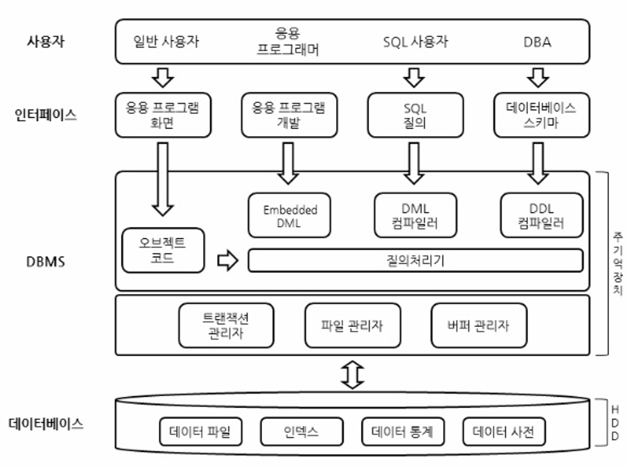 - MySQL같은 DBMS가 위의 주기억장치 부분의 역할을 수행한다. SQL질의를 해석하고 데이터베이스 스키마를 변경한다.