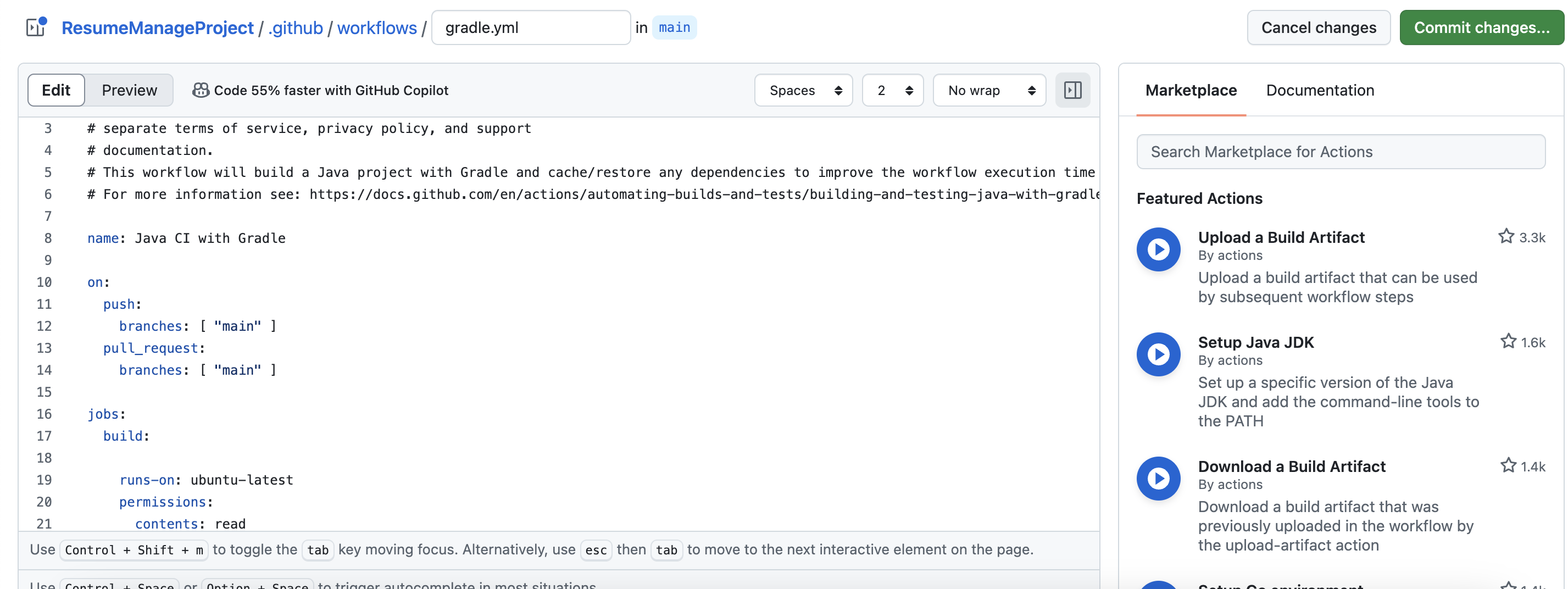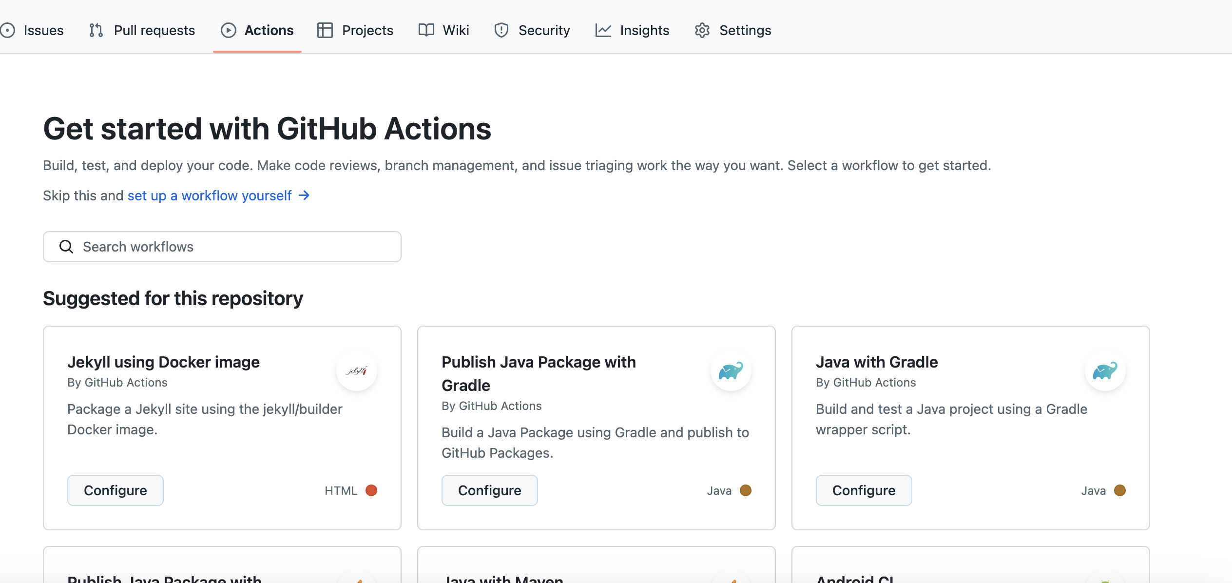 action 할 레포지토리의 action에서 java with gradle 을 가져오자. 이것을 수정해서 위 플로우를 완성할 것이다.