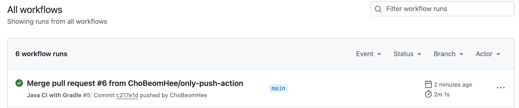 메인 브랜치에서만 작동할것이고 푸쉬 혹은 풀리퀘스트에서 작동한다.