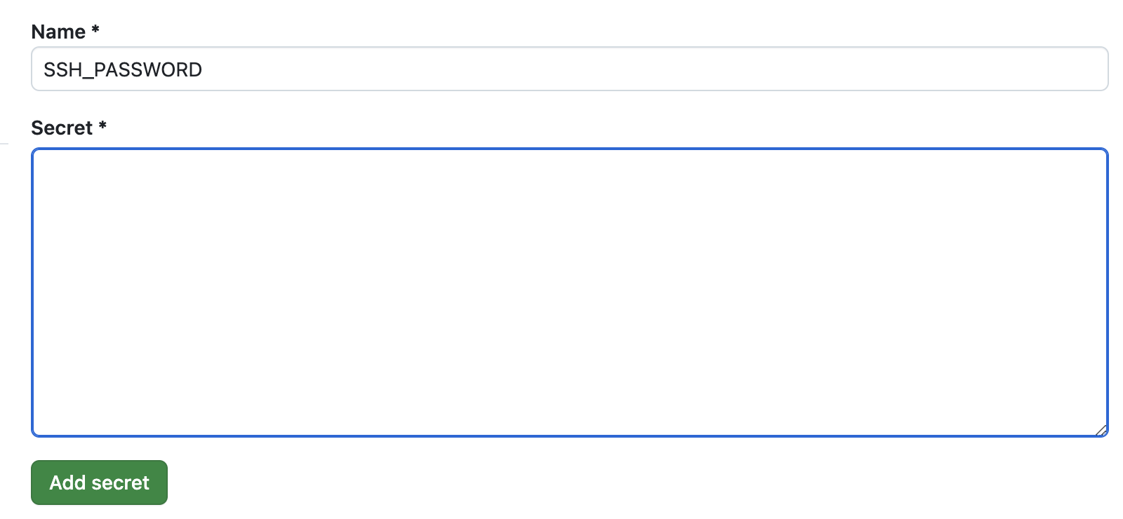 레포지토리의 setting -> Secrets and Variables -> Actions -> New repository secret 이동 후 아래 클라우드 서버에 접속하기 위한 비밀번호 입력, 이러면 이제 github action에서 안전하게 비밀번호를 사용할 수 있다.